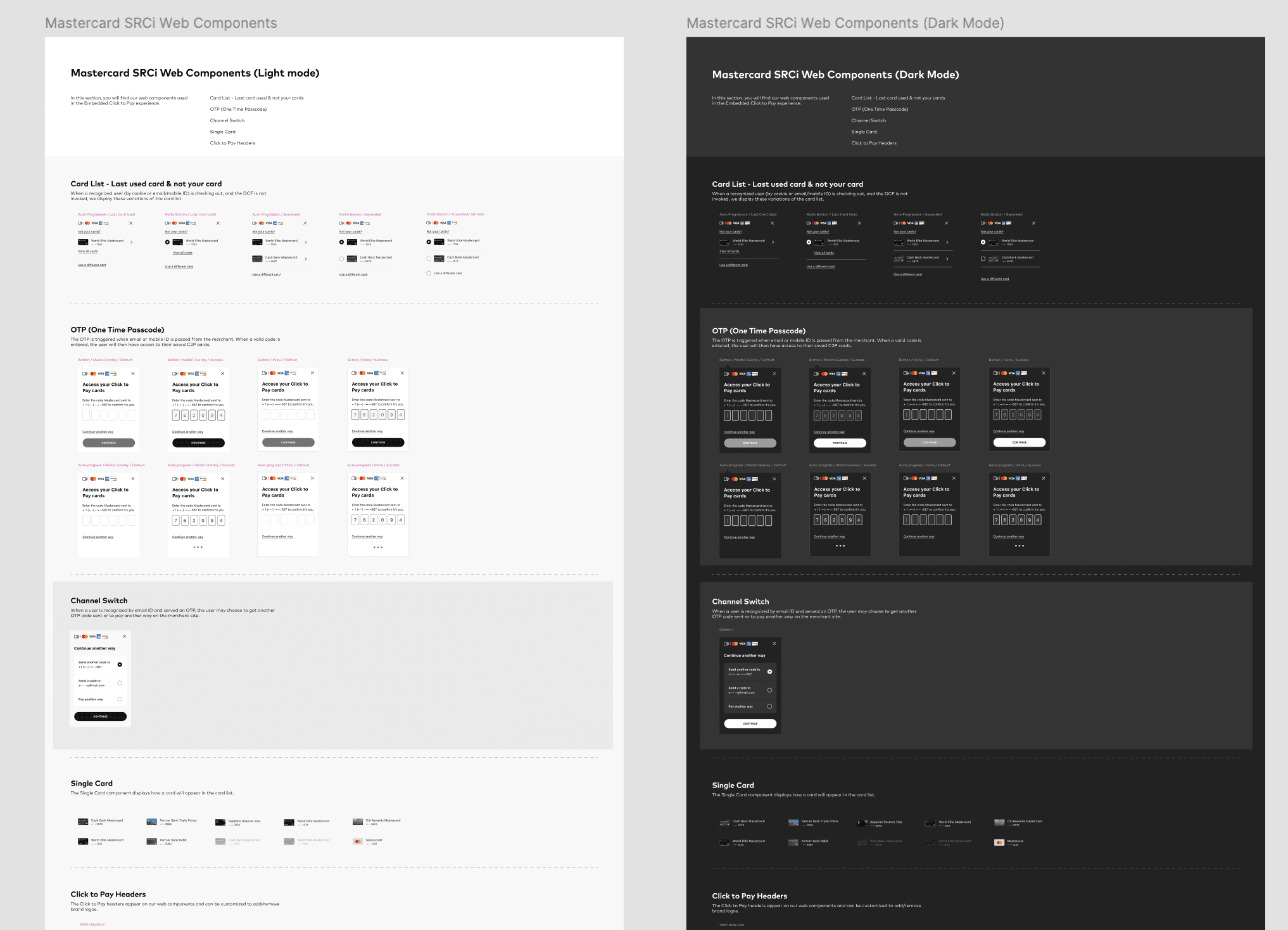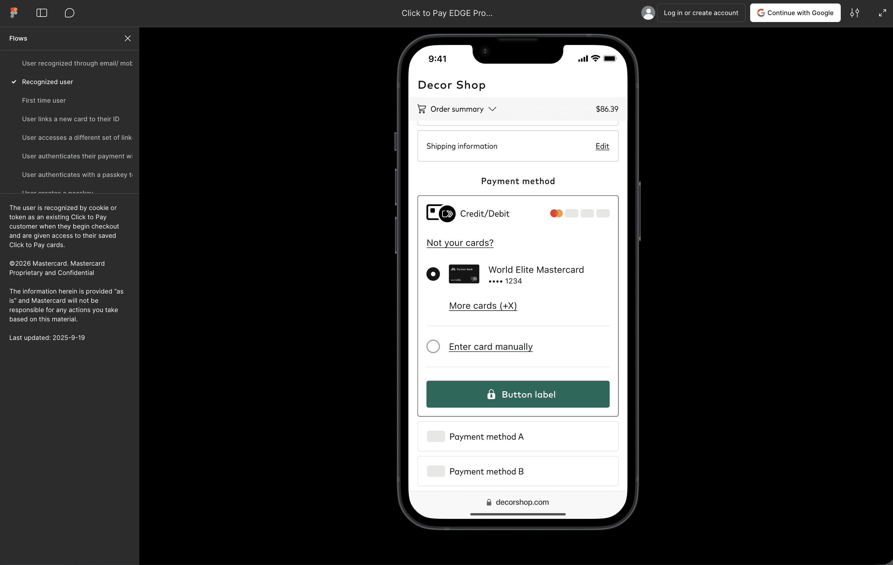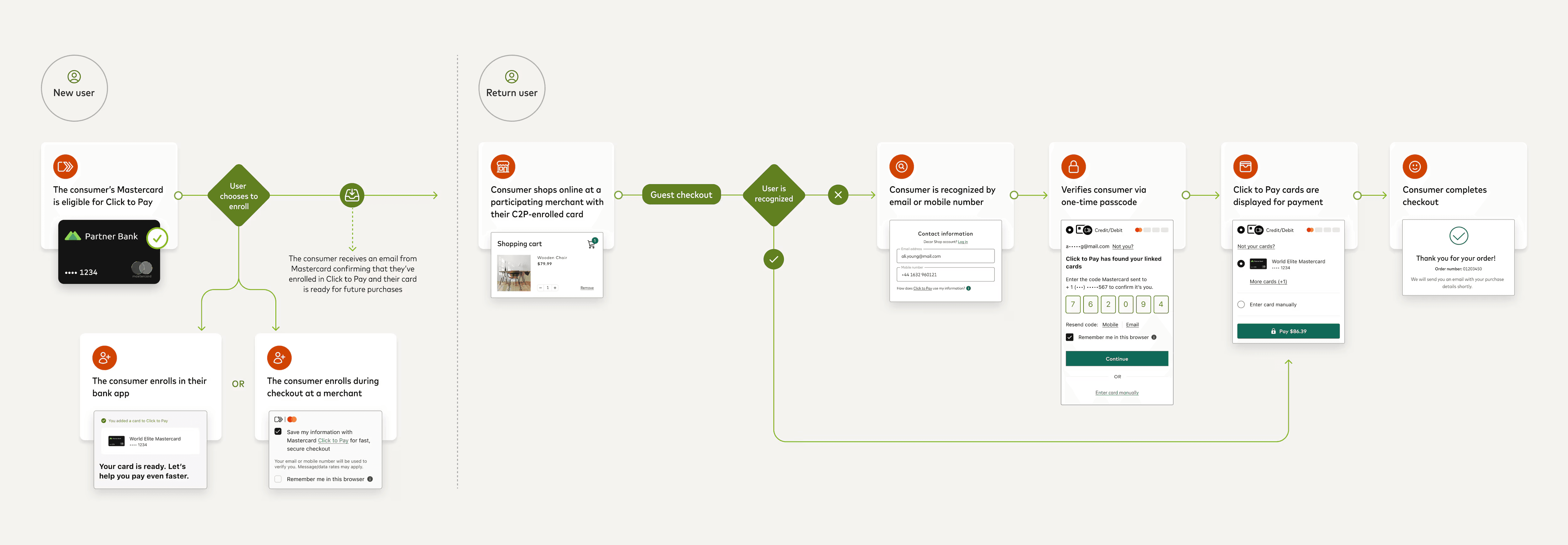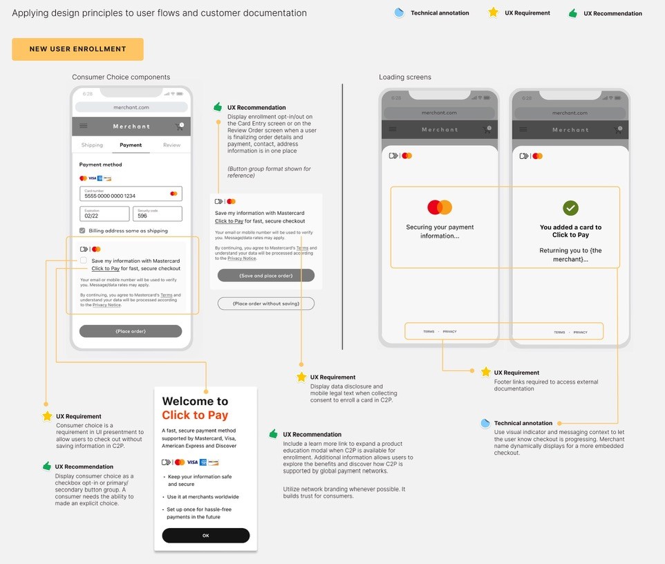 Click to Pay is a comprehensive, user-friendly checkout solution designed for various use cases. We included detailed flows with annotations, design guidance and technical implementation notes for all scenarios. The scenarios range from the most common primary ones to error states and rare edge cases.