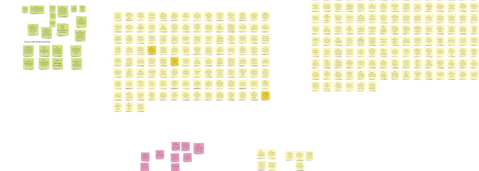 Second, I converted each data point from Excel into a sticky note in Mural. Mural I found to be a more digestible way for the project team to see. Organizing and labeling this data into meaningful groups helped bring clarity from all the notes from the user interviews and workshops.