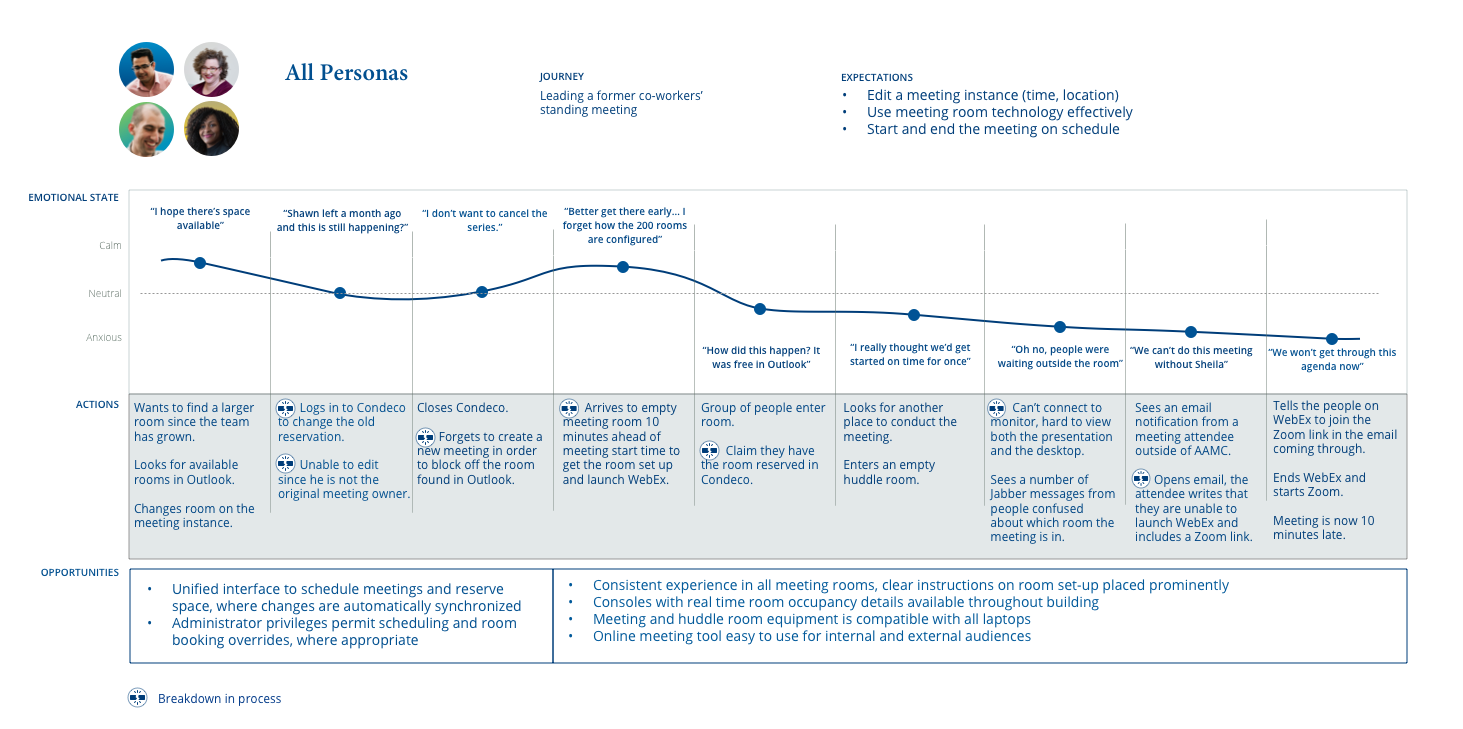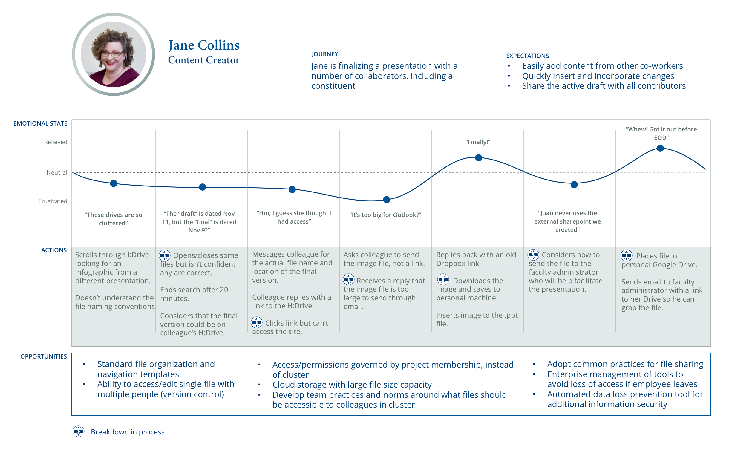 Building journey maps and personas made sharing results with our project sponsor and the department heads more clear and memorable. The themes and insights I surfaced from the research influenced which tools were recommended for the roadmap.