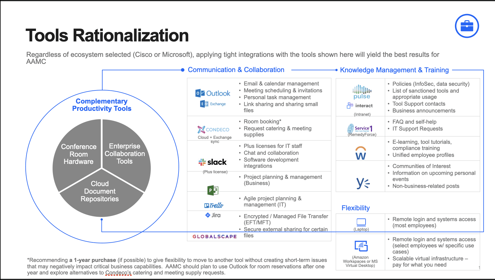 NAVAIR staff were using more than 50 different communication, file sharing, and collaboration tools - causing problems with governance, integration, security, and efficiency. Our project team was tasked to make specific recommendations for which workplace software and hardware to phase out, maintain or add.