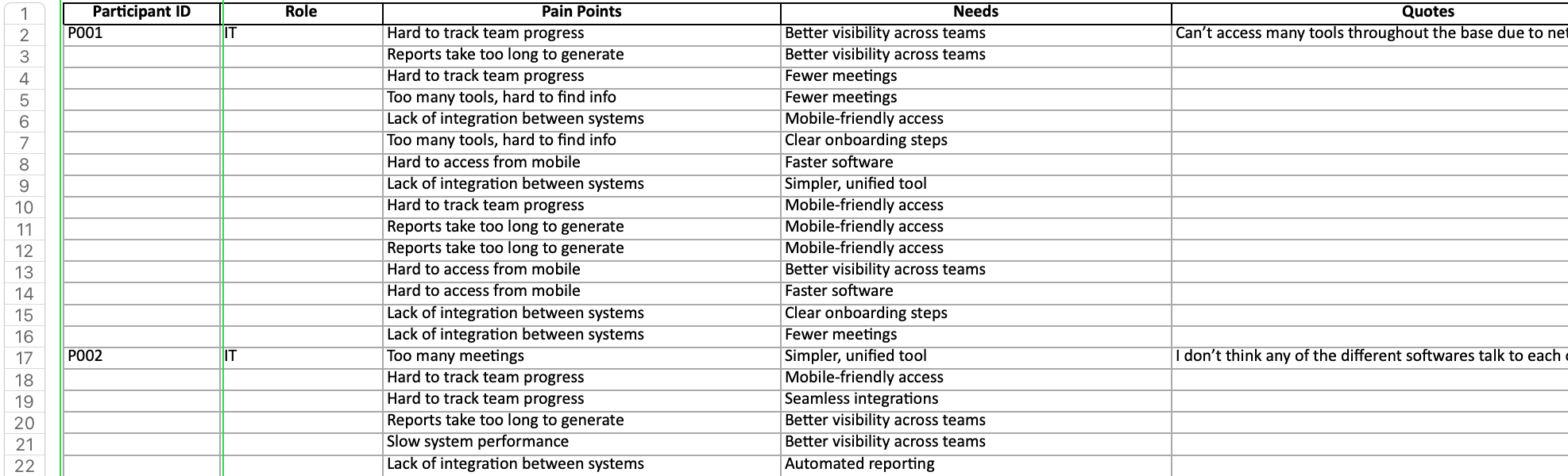First, I condensed and consolidated the raw notes into Excel (~360 lines), and coded them as Actions, Opinions, or Perceptions. I also anonymized the respondents and applied a code to differentiate by role.