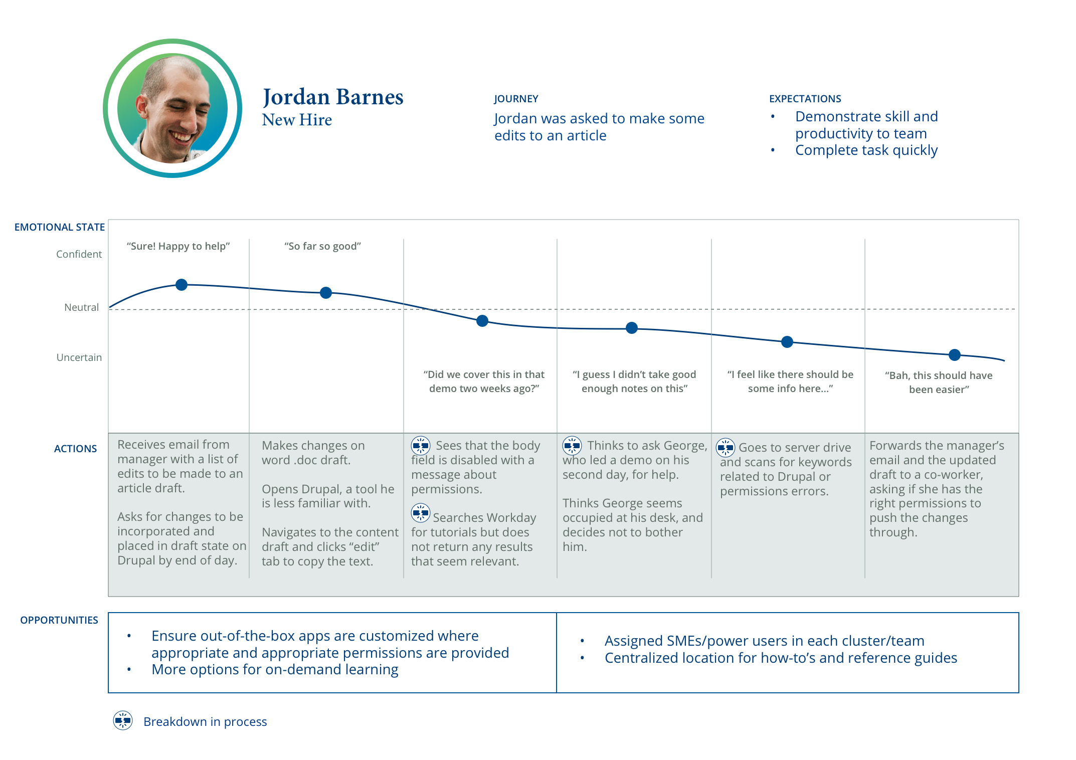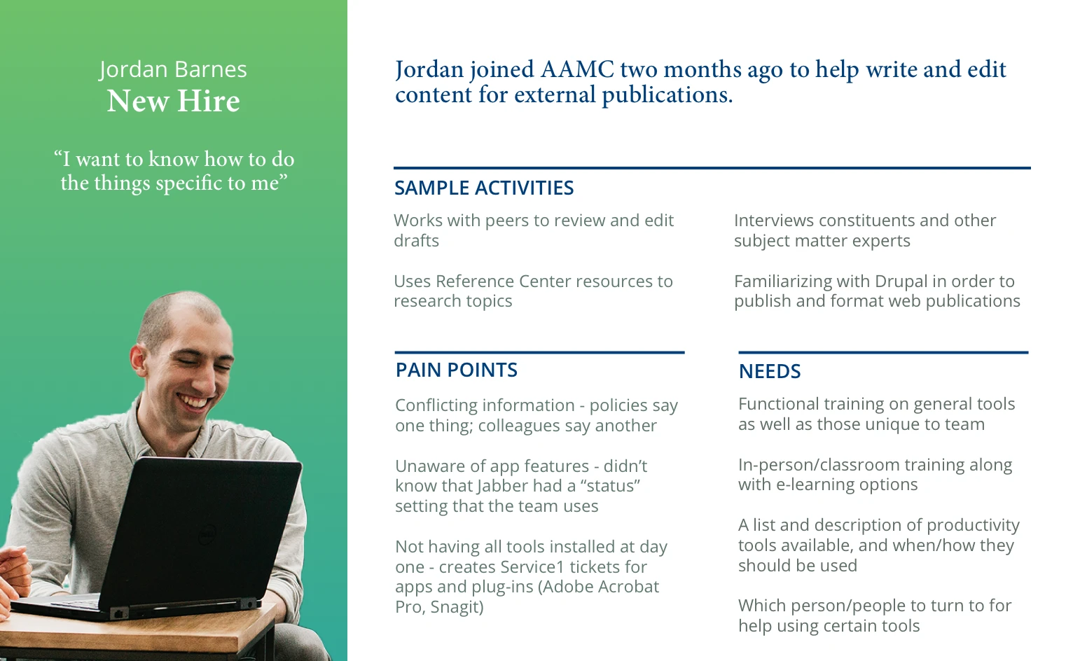 Jordan is a New Hire, and represents the issues that all staff have with training and institutional knowledge sharing, regardless of tenure.
