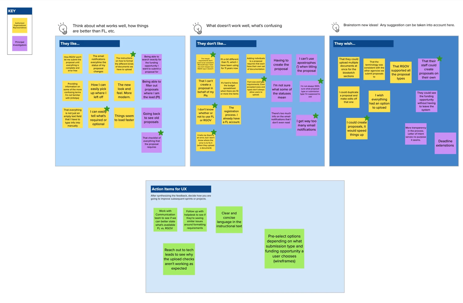 Lastly, I did the initial round of clustering of all the data into an affinity diagram that grouped user thoughts into 3 buckets: What works, what doesn't work, and new ideas. After I had done my first round of clustering, I asked the rest of the project team to do a virtual โwalk the wallโ to add their own insights, comments, or questions.